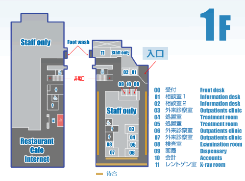 入口から入って目の前に、受付・会計・薬局の窓口があり、また、様々なご相談の方にも相談室を設けてあり、病院内で迷うことのない、スムーズな対応を心がけております。
